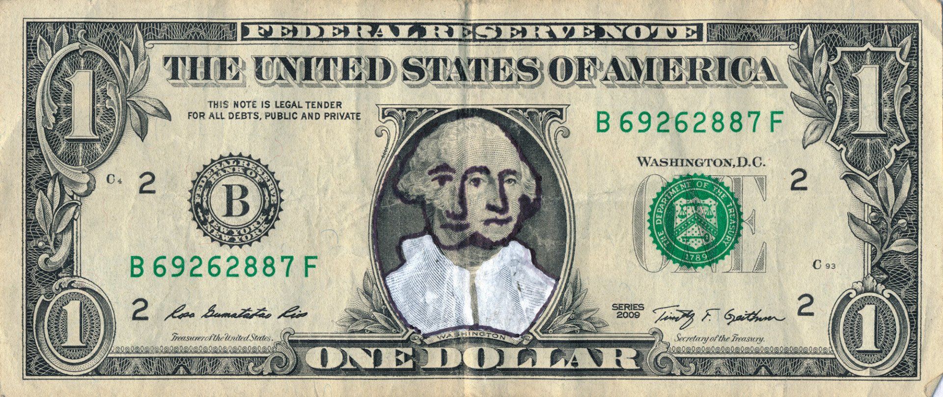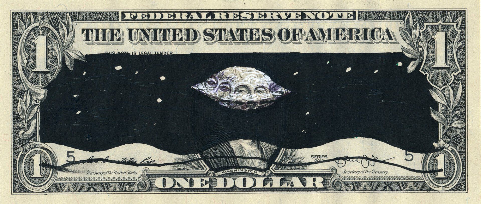"Dollarface No. 6", money art from the "Dollarfaces" series by Sebastian Bieniek (B1EN1EK), 2015. Vanish on an original one US dollar note. 6,5 cm. x 15,7 cm.