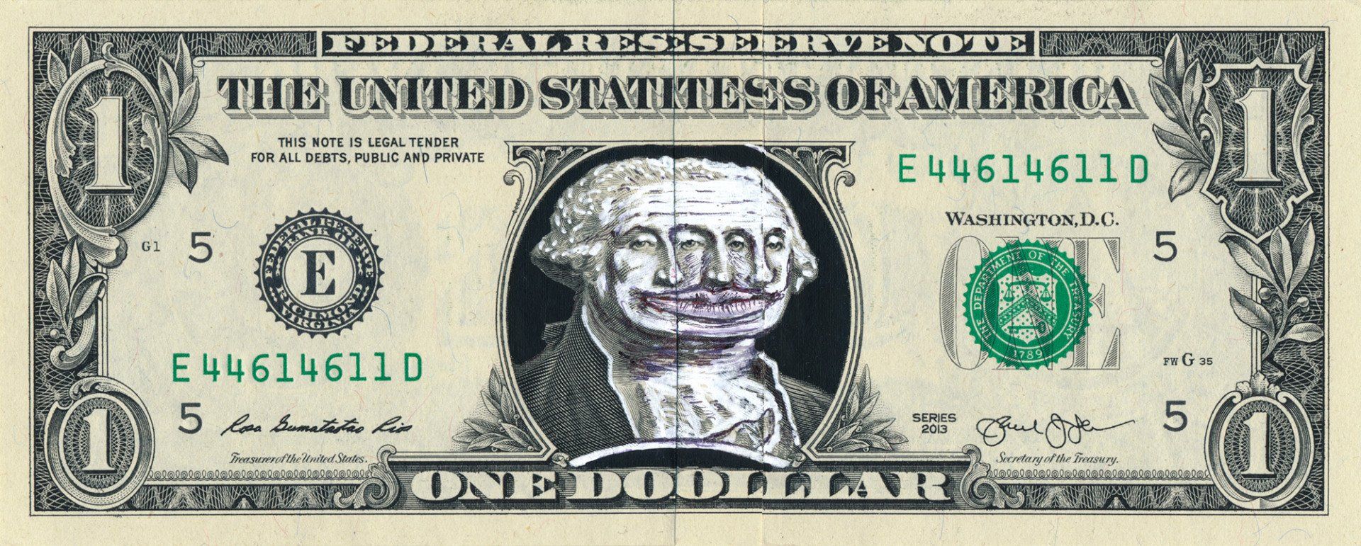 "Dollarface No. 7", money art from the "Dollarfaces" series by Sebastian Bieniek (B1EN1EK), 2015. Vanish on an original one US dollar note. 6,5 cm. x 15,7 cm.