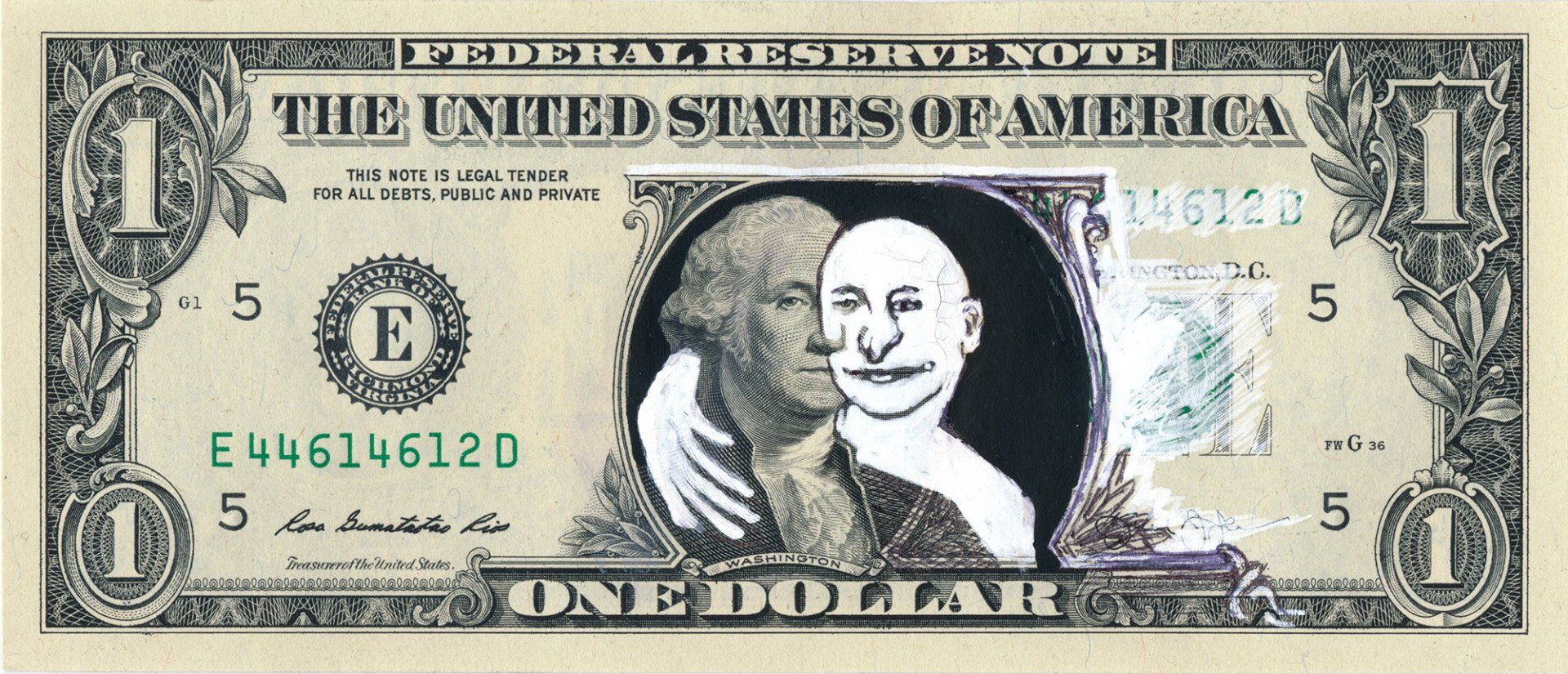 "Dollarface No. 3", money art from the "Dollarfaces" series by Sebastian Bieniek (B1EN1EK), 2015. Vanish on an original one US dollar note. 6,5 cm. x 15,7 cm. Oeuvre of Bieniekface.